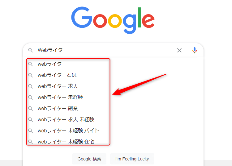 たとえば、検索するときにキーワードを入力すると、サジェストキーワード(合わせて検索される可能性が高いキーワード)が表示されます。